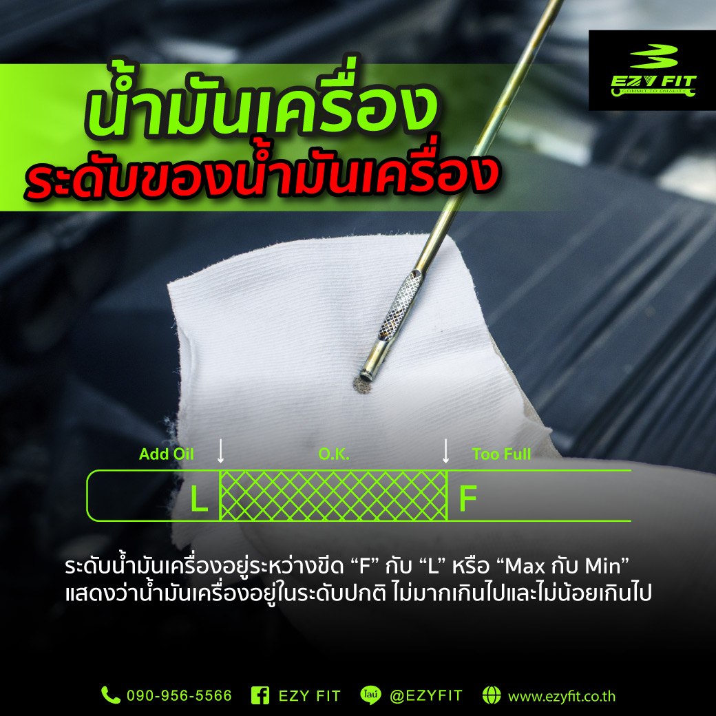 ระดับน้ำมันเครื่องอยู่ระหว่างขีด F กับ L หรือ Max กับ Min แสดงว่าน้ำมันเครื่องอยู่ในระดับปกติไม่มากเกินไปและไม่น้อยเกินไป