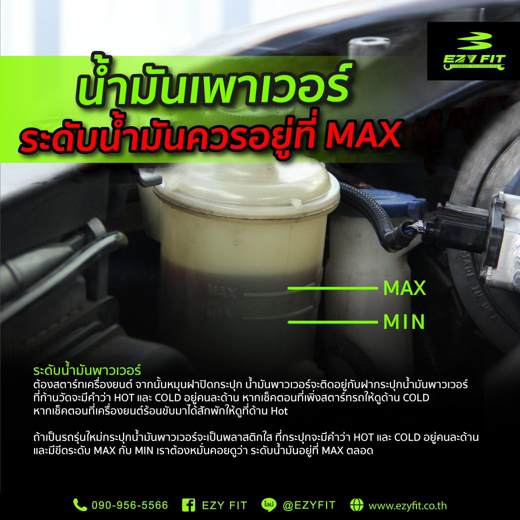 👉ถ้าเป็นรถรุ่นใหม่กระปุกน้ำมันพาวเวอร์จะเป็นพลาสติกใสที่กระปุกจะมีคำว่า HOT และ COLD อยู่คนละด้าน และมีขีดระดับ Max และ Min ต้องหมั่นคอยเช็คระดับน้ำมันตลอดให้อยู่ที่ MAX เสมอรัช