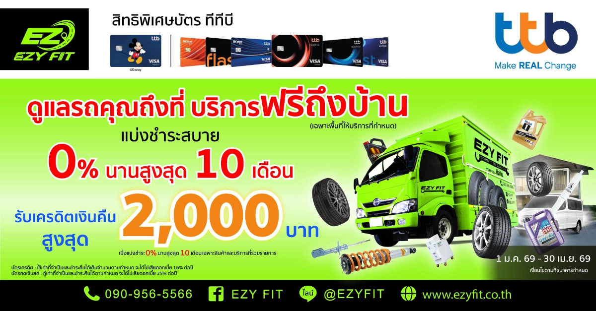 🏠อีซี่ ฟิต ดูแลรถคุณถึงที่ บริการฟรีถึงบ้าน ….. แบ่งชำระดอกเบี้ย 0% นานสูงสุด 10 เดือน รับเครดิตเงินคืนสูงสุด 2,000 บาท / ท่าน (คำนวณบัตรหลักทุกใบและบัตรเสริมร่วมกัน) / เดือน