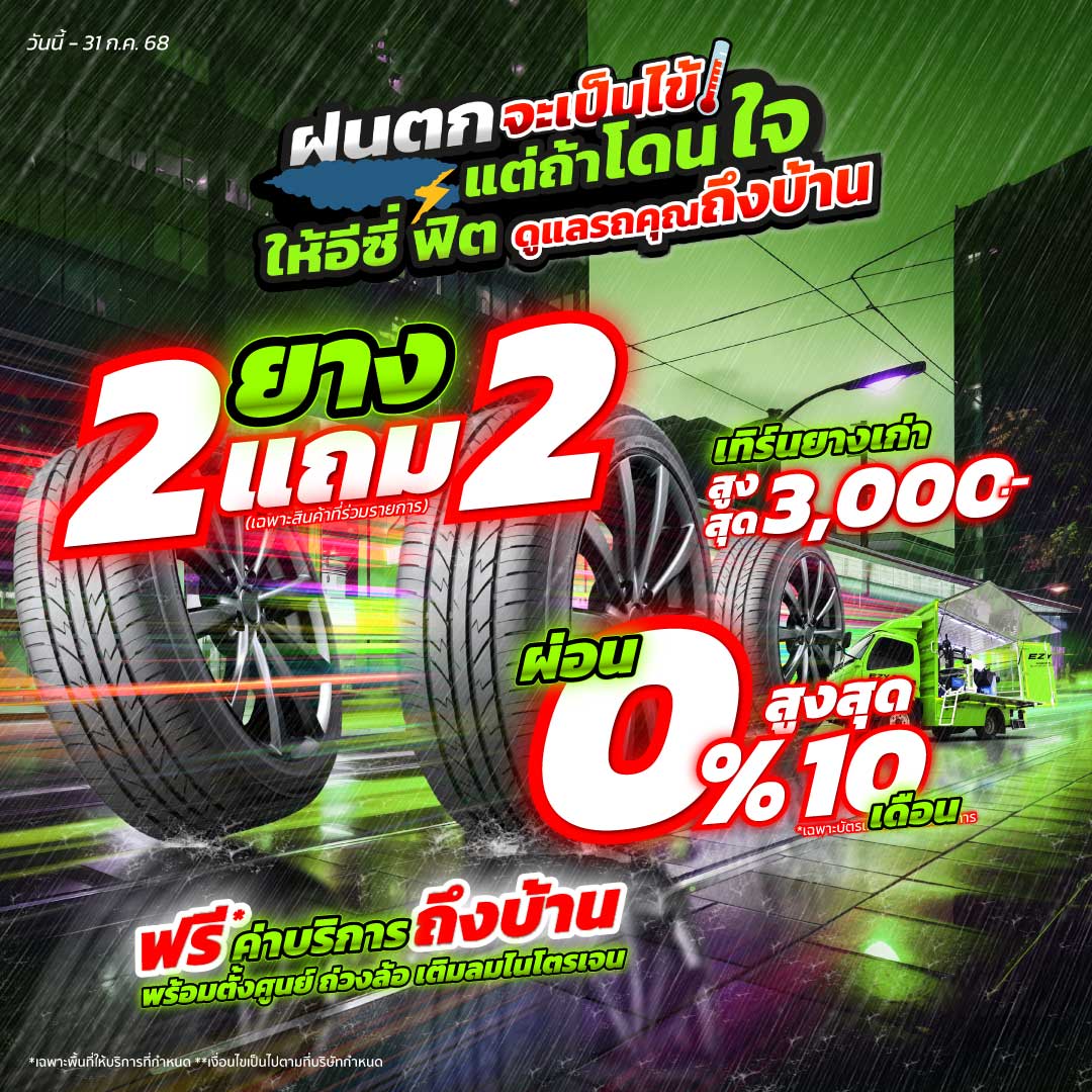 หน้าฝนนี้ไม่ต้องออกไปไหนรออีซี่ ฟิตไปบริการถึงบ้านได้เลยlโปรผ่อน 0% 10เดือน ยางซื้อ 2 แถม 2