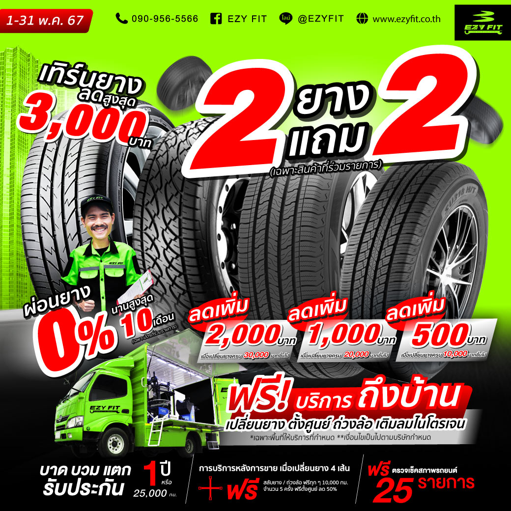 โปรยางซื้อ 2 แถม 2 ส่วนลดเทิร์นยางสูงสุด 3,000 บาท เมื่อซื้อยางกับอีซี่ ฟิตรับบริการเปลี่ยนยาง ตั้งศูนย์ ถ่วงล้อถึงที่บ้านเลย....