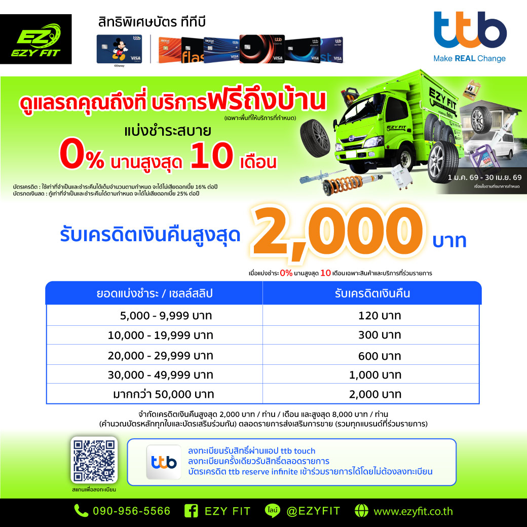 🏠อีซี่ ฟิต ดูแลรถคุณถึงที่ บริการฟรีถึงบ้าน ….. แบ่งชำระดอกเบี้ย 0% นานสูงสุด 10 เดือน รับเครดิตเงินคืนสูงสุด 2,000 บาท / ท่าน (คำนวณบัตรหลักทุกใบและบัตรเสริมร่วมกัน) / เดือน